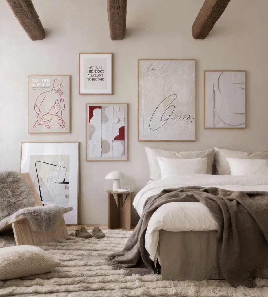 Wall art provides excellent opportunities to express personality while supporting your overall home decor ideas bedroom aesthetic. Above-bed artwork creates natural focal points, while gallery walls can showcase personal collections or meaningful pieces.
